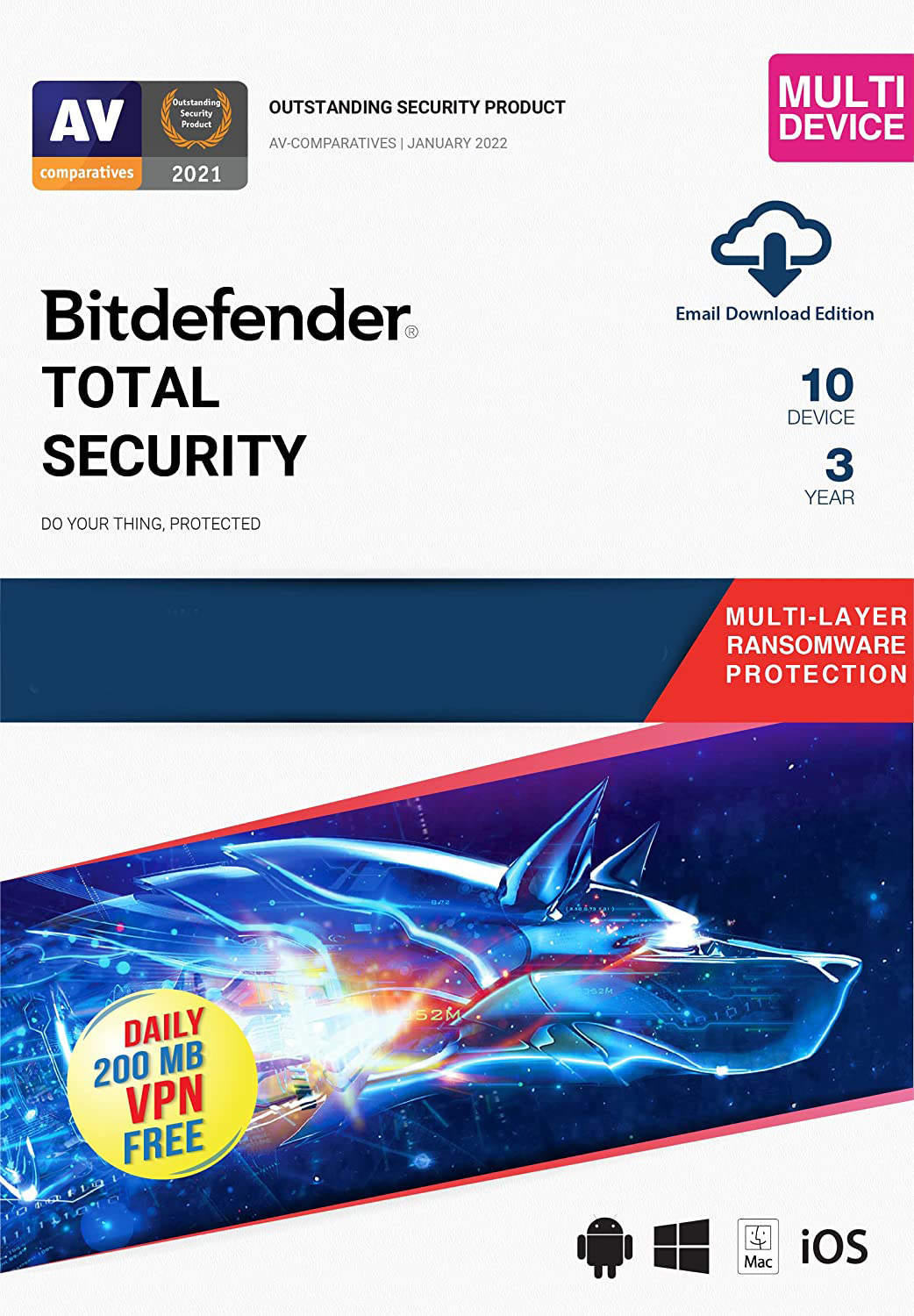 Bitdefender Total Security 10 Devices 3 Year Windows/Mac/Android/iOS (Digital Delivery)