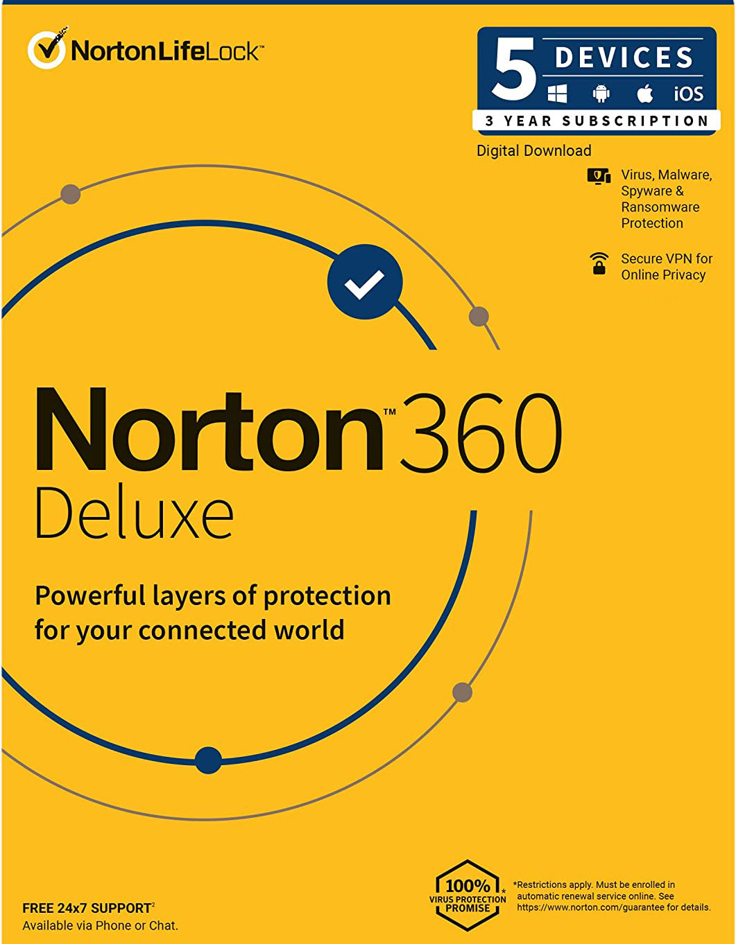 Norton 360 Deluxe 5 Devices 3 Year Windows/Mac/Android/iOS (Digital Delivery) (Global Key)